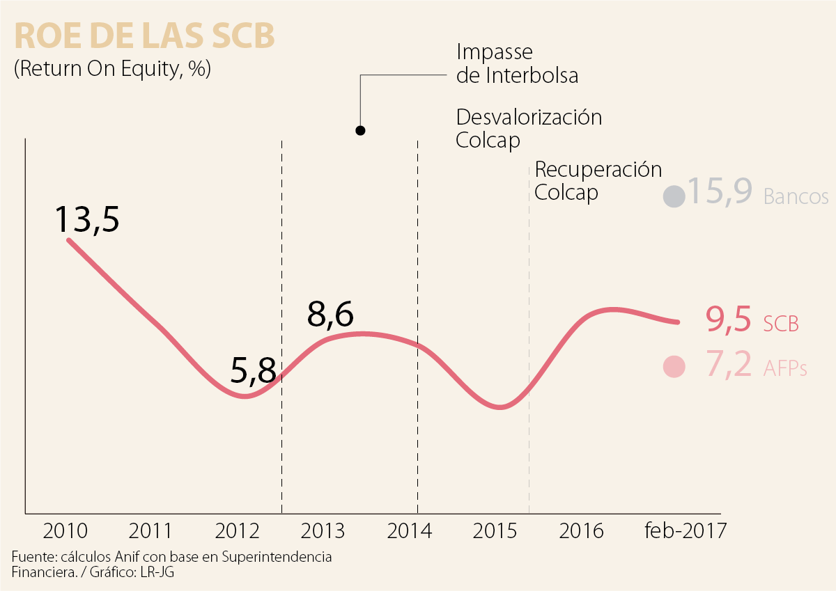Las SCB han visto reducidos sus márgenes dada la elevada competencia. Se han presentado evidentes reducciones en las comisiones en: i) acciones, donde las comisiones han colapsado a 0,2% del valor de la operación; ii) el mercado cambiario, donde hay cobros cercanos a 30 centavos/US$; y iii) el mercado de renta fija, donde las comisiones rondan 0,15- 0,2pb.