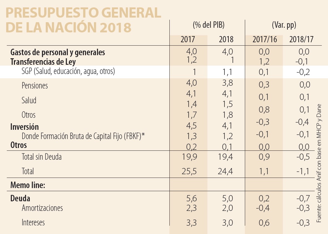 Sin embargo, es clave que el rubro del SGP crezca en términos reales a ritmos cercanos al 2% para poder honrarle a los territorios sus obligaciones con los gastos en salud y educación. Esto luce difícil de cumplir dado el estancamiento del recaudo tributario del GC en niveles del 14% del PIB, por debajo del 16%-17% del PIB observado en América Latina. Más aún, en lo corrido de 2018, dicho recaudo muestra caídas del -2% real anual (vs. la meta del +3,5%).