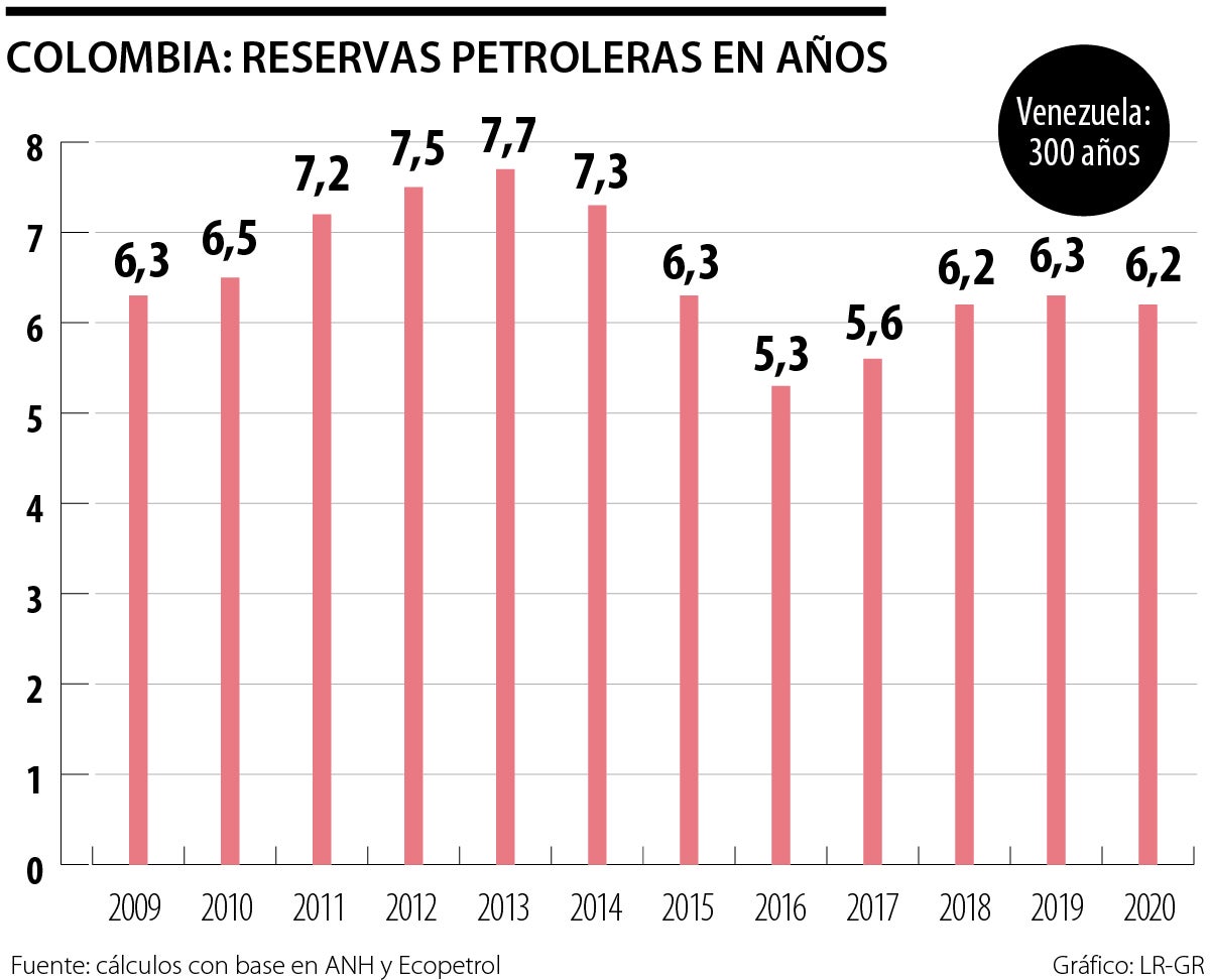 Por ejemplo, frente al promedio quinquenal anterior cercano a los 800.000 barriles/día, en 2021 se observó perdida de 75.000 debido al sacrificio que ha implicado la “ordeñada” constante de Ecopetrol por cuenta de los faltantes fiscales. Además, los hallazgos recientes en Colombia han sido de poca monta, tanto en petróleo como en gas, y los aportes del Permian en Estados Unidos aun son marginales. No en vano sabemos que las reservas petroleras tan solo dan para seis años más (ver gráfico adjunto); y aunque las reservas de gas darían para tres décadas, allí se tiene un serio problema de costos de distribución que hace que el precio local duplique el internacional.