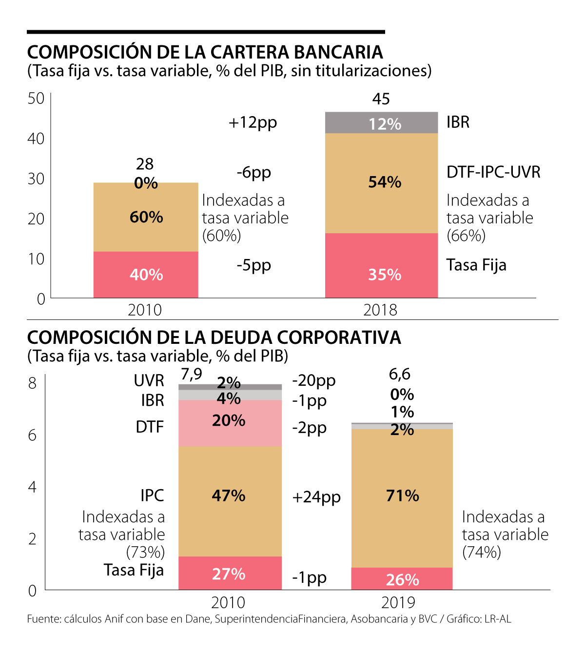 En lo referente a la cartera bancaria indexada al IBR, esta ha venido creciendo a tasas promedio del 48% anual entre 2015-2018. Sin embargo, la participación de la deuda indexada al IBR en el total de la cartera (sin titularizaciones) tan solo alcanza niveles del 12%. Si bien este es un avance frente a los niveles nulos que se tenían en 2010, aún se tiene que la preferencia es por atar esas tasas flotantes en un 54% a la DTF-IPC-UVR. To- davía se tiene un 35% de la cartera pactada a tasa fija, ver gráfico 1.