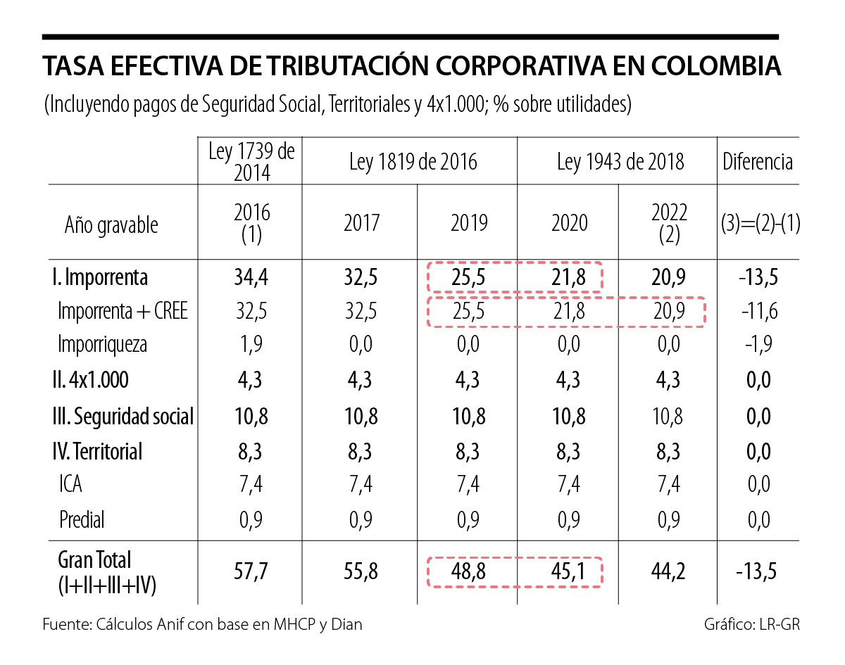En efecto, los cálculos de Anif indican que esta última Ley estará reduciendo la carga efectiva corporativa (por toda fuente) desde el 48% ya programado hacia un 45% en 2020 y un 44% en 2022 (inclusive por debajo del promedio de países OCDE). Esto, como consecuencia de haber reducido la tasa del Imporrenta del 33% hacia el 30% y de los reconocimientos a cargo del ICA y las devoluciones del IVA relacionadas con la adquisición-formación de maquinaria. Pero nótese que esto implica un monumental sacrificio fiscal, al reducirse el recaudo neto en cerca del 1% del PIB (según lo arriba explicado).
