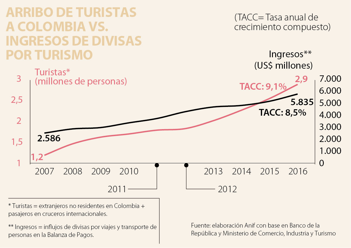 Las cifras al cierre de 2016 dan cuenta de que la actividad turística en el país ha mostrado un dinamismo interesante. Por ejemplo, los arribos de turistas se estiman en casi 3 millones; con tasas de ocupación hotelera del orden de 56%; y generación de divisas de unos US$5.800 millones anuales (todas ellas cifras récord). Nótese que la cifra de viajeros a Colombia dista de la de turistas, pues de los 5 millones de arribos al país, 2 millones son de colombianos residentes en el extranjero o se realizan desde zonas fronterizas, lo cual genera ruido sobre la cifra real de turistas en el país.