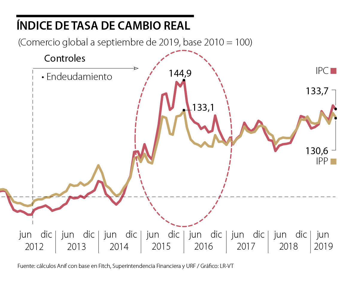 Durante 2006-2014 se dio una importante escalada tanto en los volúmenes de petróleo (pasando de 530.000 bpd hacia cerca del millón de barriles por día) como en los de carbón (de 66 a 85 millones de toneladas/año), que, además, coincidió con un gran auge en los precios del petróleo (pasando de US$40/barril a los US$95). Ello propició desplomes de la TRM hacia niveles promedio/año de $2.000/dólar, los cuales persistieron durante 2011-2014, implicando sobreapreciaciones cambiarias reales del orden de 25%-30% (en el acumulado).
