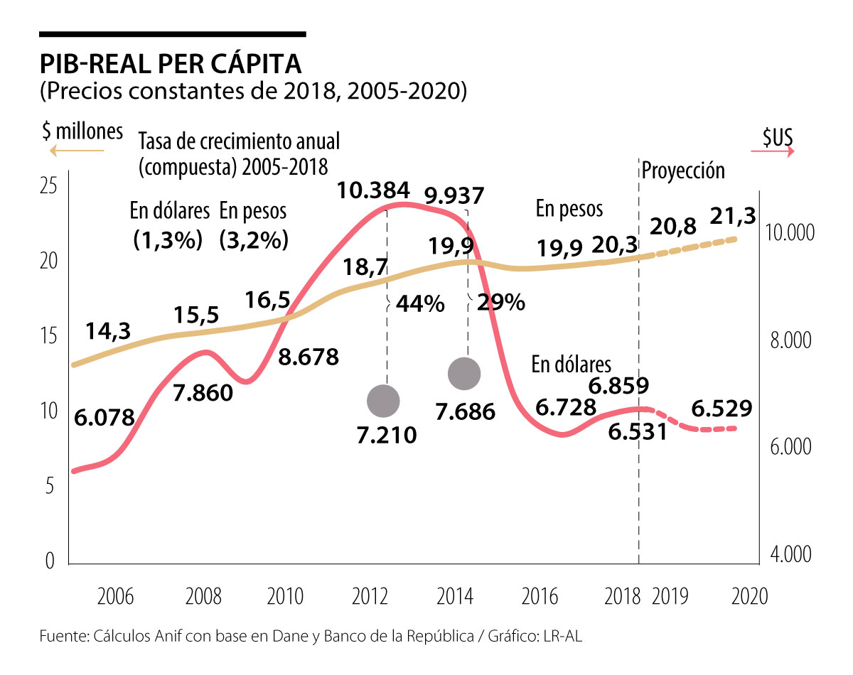 Anif había mencionado que el nivel de dicho PIB per cápita en dólares claramente estaba inflado por cuenta de la apreciación cambiaria generada durante la fase ascendente del súper-ciclo de commodities (2002-2013). La EH (antes comentada) terminó por desalinear la tasa de cambio respecto de su Paridad de Poder Adquisitivo (PPA) de largo plazo, inflando artificialmente la lectura del valor del PIB-real per cá-pita de Colombia de los US$3.900 en 2002 a cerca de US$10.400.