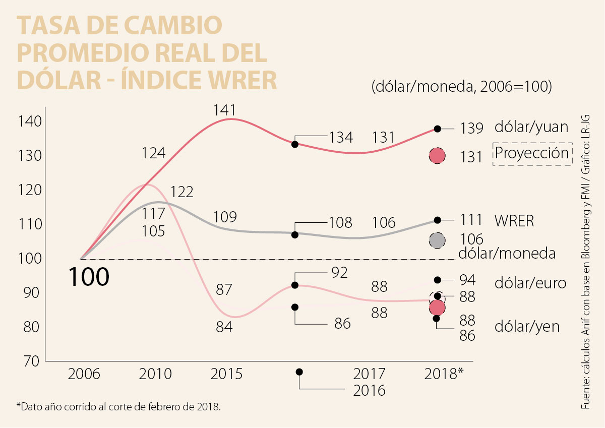 Cabe entonces preguntarse, ¿Dónde quedan los pronósticos cambiarios para 2018? En los gráficos adjuntos se observa que Anif es de la opinión que habrá una reversión cambiaria respecto de lo observado en este inicio de año, pero no tan marcada como para pensar en una “apreciación significativa del dólar”, según lo sugirieron el Presidente Trump y su Secretario del Tesoro recientemente en Davos. En efecto, la tasa promedio real ponderada (contra el yuan, el yen y el euro) creemos que arrojará un valor de 106 en 2018, similar a la observada en 2017.