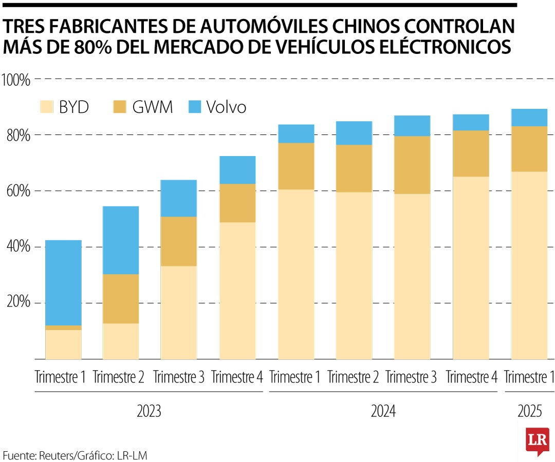 Al sumar las unidades vendidas de las marcas que ocupan el podio, se obtiene 70% de participación de mercado en lo que va del año. solo la china BYD concentra 54%