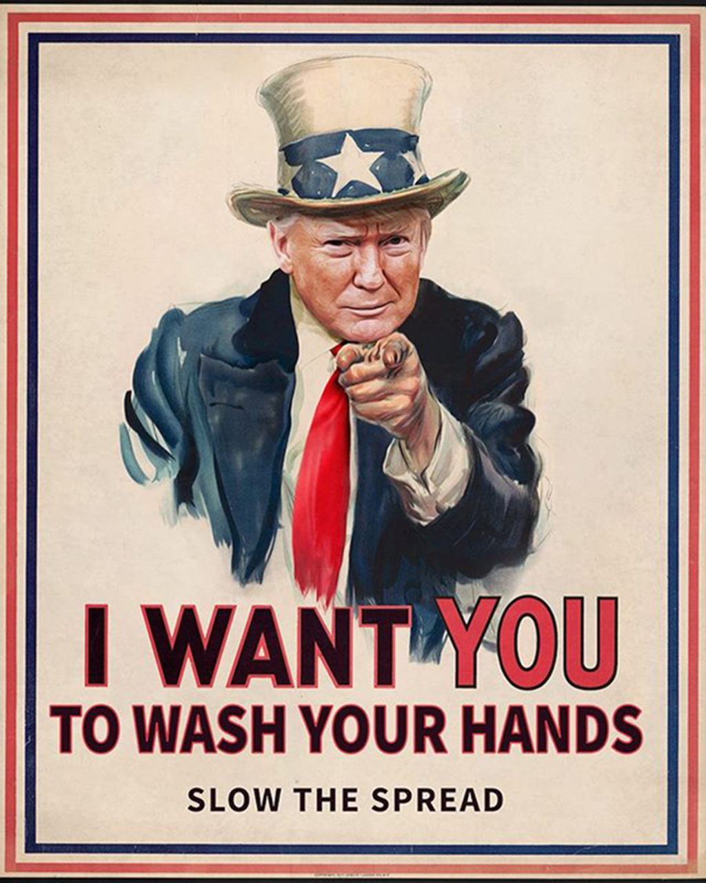 “Quiero que te laves las manos”. Esa es la frase que se usó ingeniosamente en una nueva versión del icónico afiche del Tío Sam, que fue creado hace 103 años por el ilustrador James Montgomery Flagg (1877) para que los estadounidenses se alistaran al Ejército. Bajo ese mismo tono imperativo, ahora es Donald Trump (1946), quien le pide a los americanos algo también de vida o muerte: lavarse las manos para evitar el Covid-19. (VP)