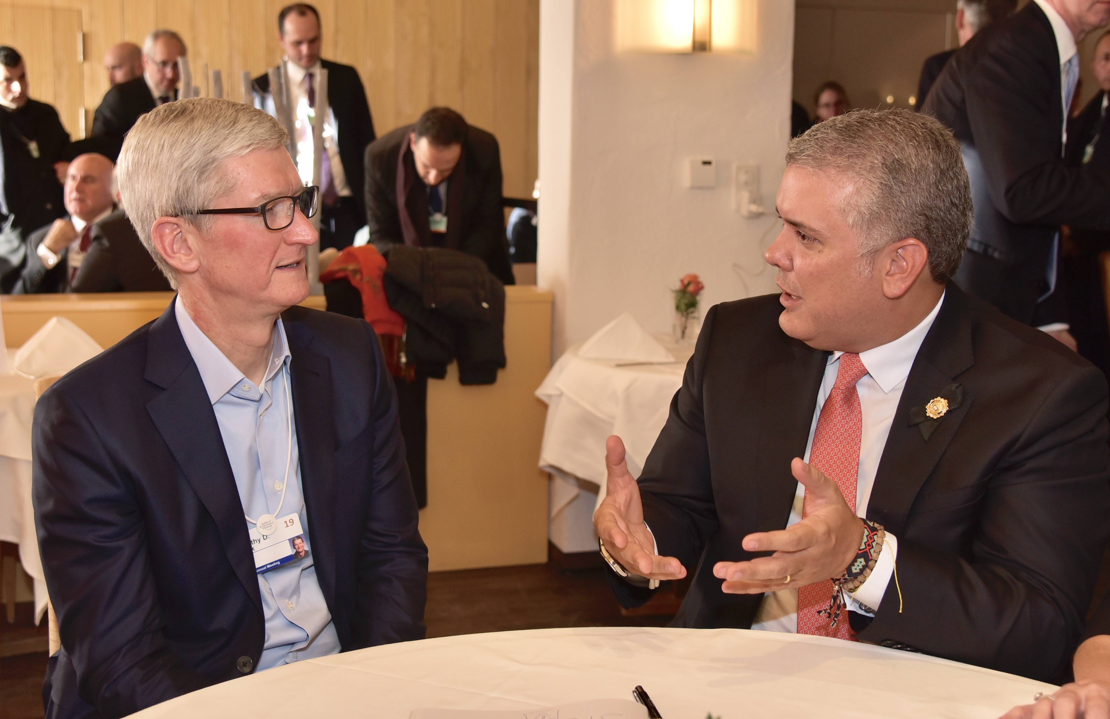 En el cierre de su participación en el Foro Económico Mundial, en Davos, el presidente Iván Duque (1976) se reunió con uno de los hombres más importantes del mundo: el CEO de Apple, Tim Cook (1960). En un video, Cook dijo que hablaron de educación, pero en un trino, el Presidente dijo que el empresario también le había manifestado su interés de invertir en Colombia.