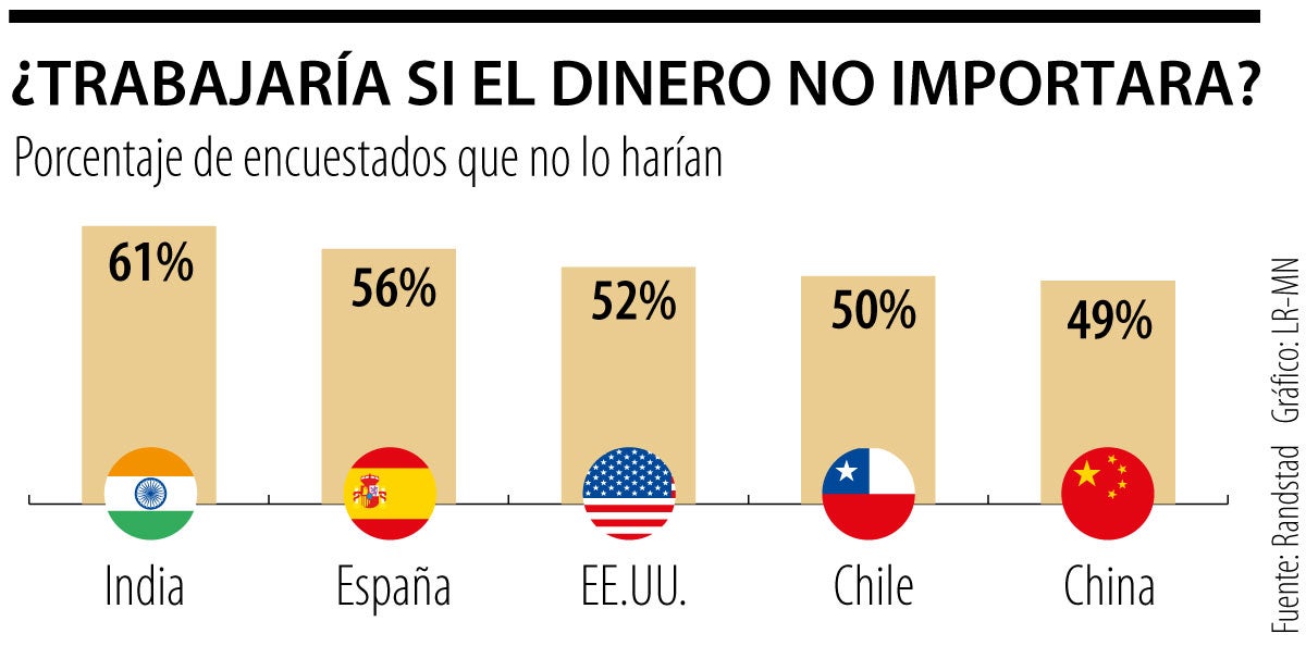 Una última encuesta de Randstad puso a dudar a los trabajadores de si realmente les gusta laboral, pues preguntó si lo seguirían haciendo aun si el dinero no importara. India fue el país en donde más personas dijeron que no trabajarían (61%), le siguió España con 56% y cerró el top tres Estados Unidos con 52%. De la región en el top 10 aparecen Chile (50%), Argentina (45%) y Brasil (39%). (SS)