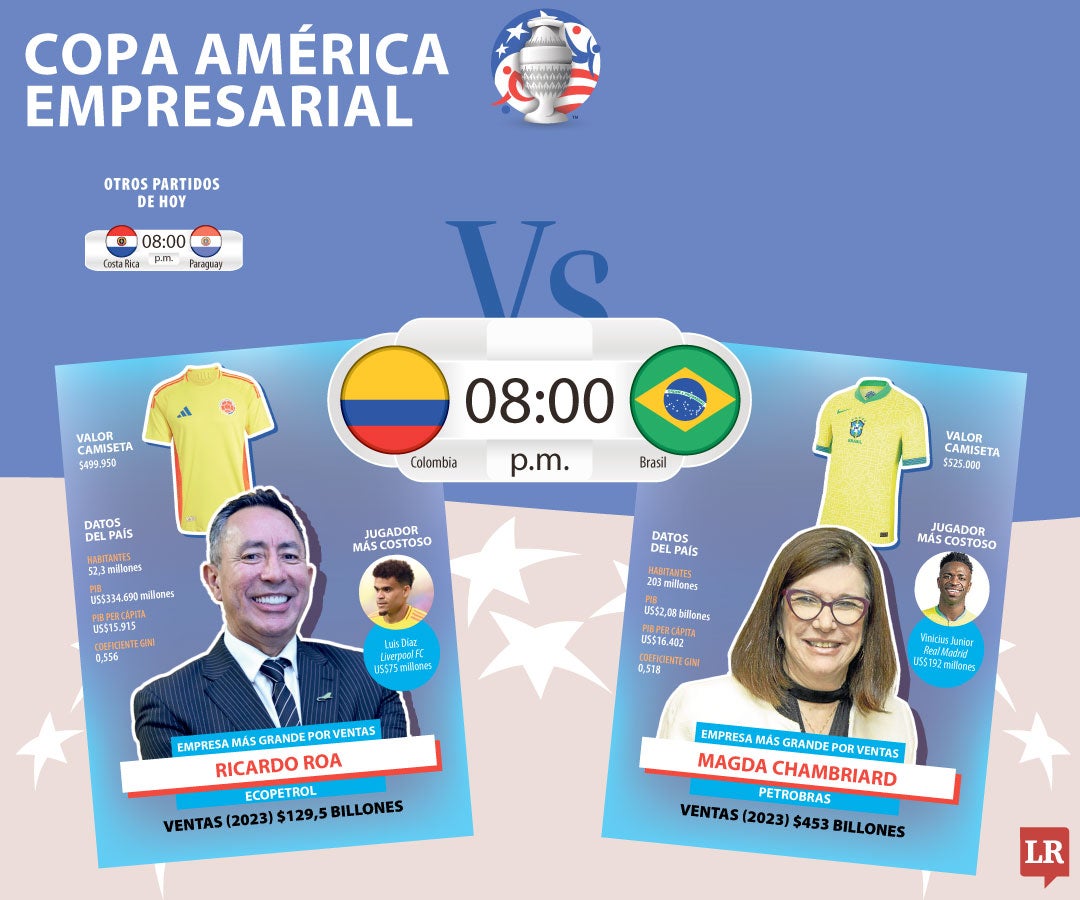 El duelo económico de ambos es similar a su historial deportivo. Brasil no solo es más grande geográficamente, también cuenta con 203 millones de habitantes y con un PIB de US$2,08 billones; el PIB per cápita de este país está en US$16.402. Estos números la convierten en la economía más grande de la región. En el caso de Colombia, el país es la quinta economía más relevante con un PIB de US$334.690 millones.