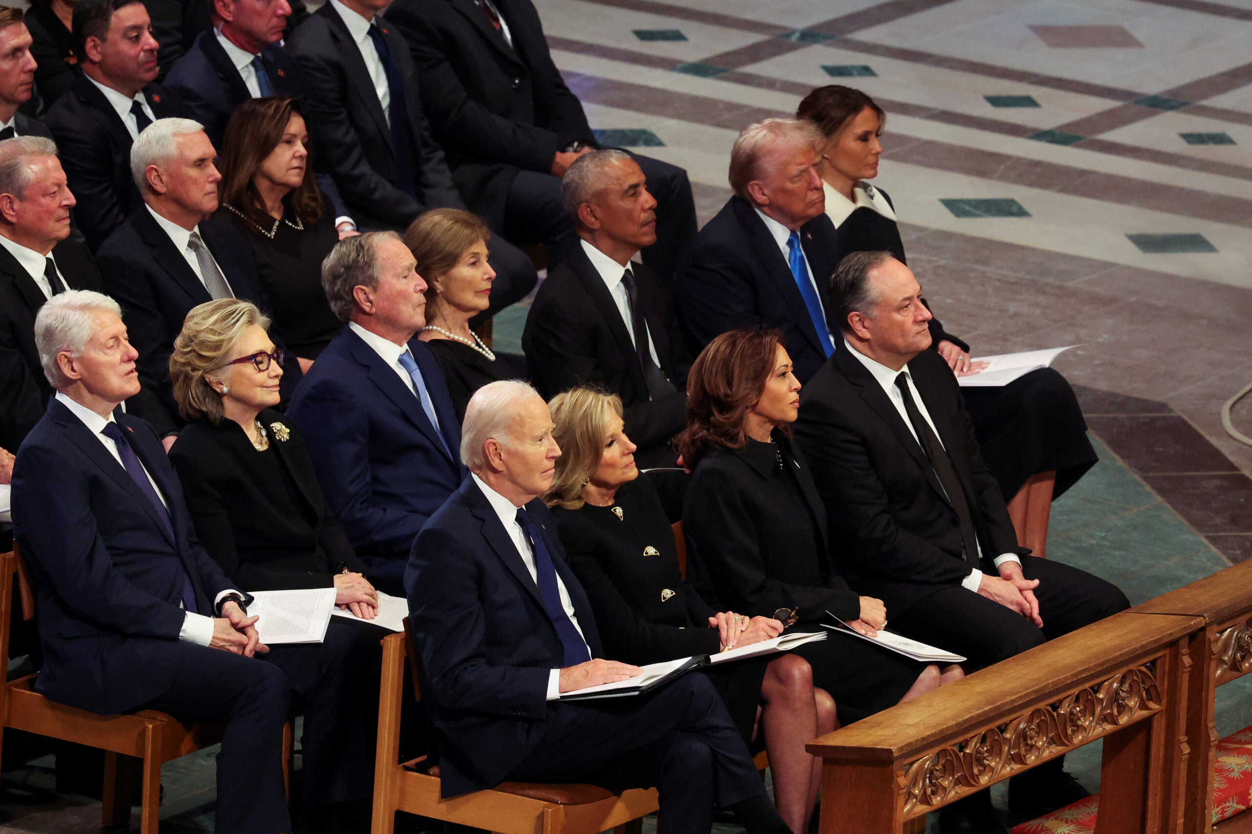 Diferentes personalidades asistieron hoy a la Catedral Nacional de Washington, en Estados Unidos, para homenajear al exmandatario Jimmy Carter (1924-2024). Llamó la atención que el lugar fue punto de encuentro para cuatro expresidentes de EE.UU. quienes se sentaron en las primeras filas de asientos: Donald Trump (1946), Barack Obama (1961), George W. Bush (1946) y Bill Clinton (1946). Joe Biden, su compañero demócrata, pronunció el panegírico del 39º presidente, fallecido el 29 de diciembre de 2024 a la edad de 100 años. También asistió la vicepresidenta Kamala Harris (1964). Carter ocupó el cargo de Presidente de EE.UU. entre 1977 y 1981 y fue galardonado con el Premio Nobel de la Paz en 2002. (VPD)