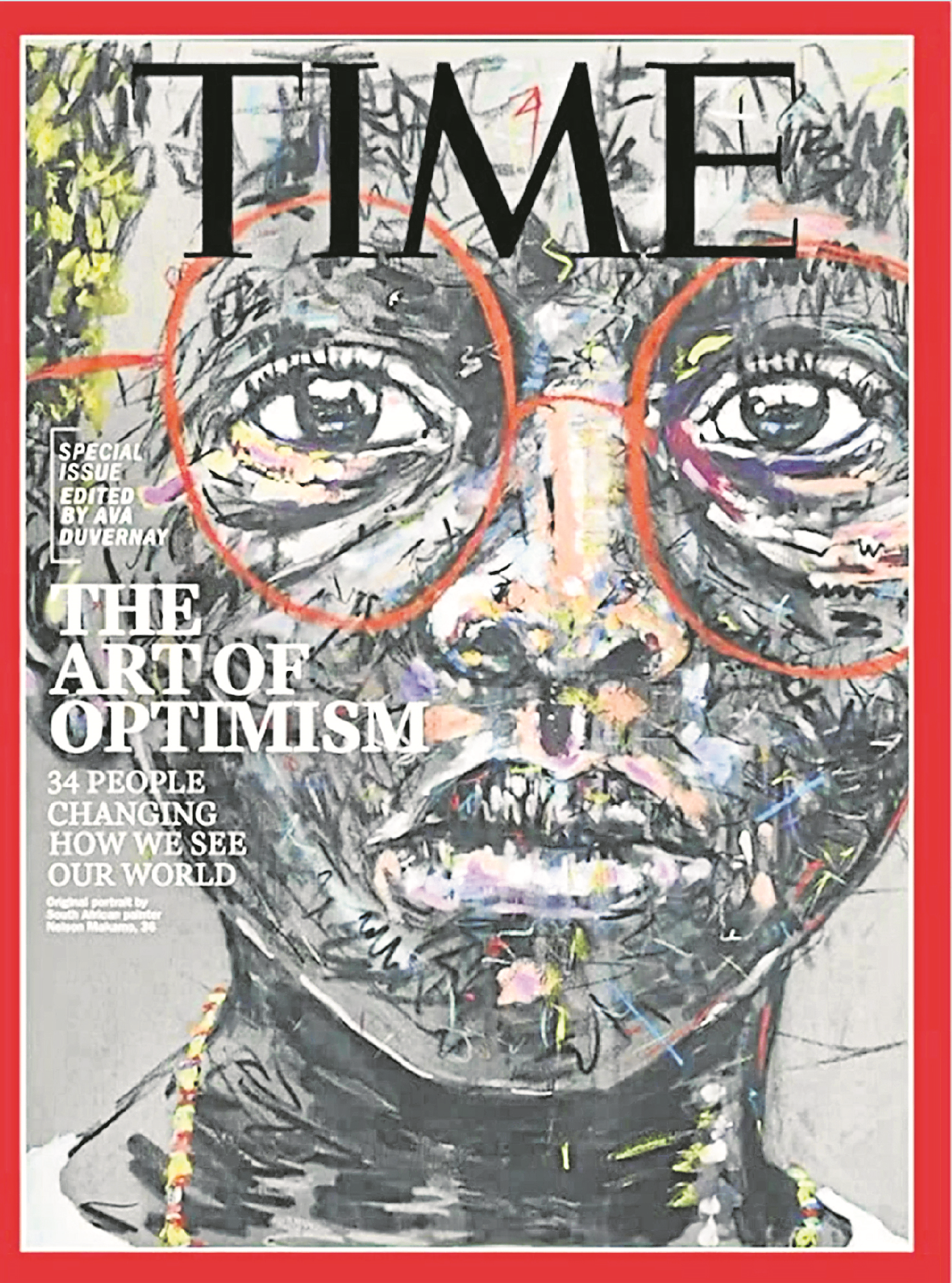 La edición que circula de la revista Time reúne a 34 personalidades que están cambiando al mundo. Ava DuVernay (1972), la primera directora afroamericana nominada al Oscar, es la editora invitada para este número sobre el optimismo. Entre los escritores de la revista están el fundador de Microsoft, Bill Gates (1955), y el director Guillermo del Toro (1967). La portada es una obra del artista Nelson Makamo.