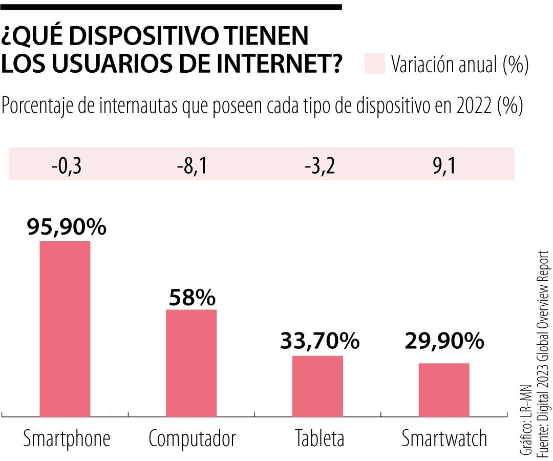 Los computadores quedan cada vez más rezagados en la competencia contra los teléfonos móviles, sin duda, el dispositivo número uno para usar internet entre todas las generaciones. Los computadores experimentaron algunas de las mayores caídas año tras año según el Digital 2023 Global Overview Report. Más de 95% de los usuarios de internet tenía un teléfono móvil el año pasado. (TA)