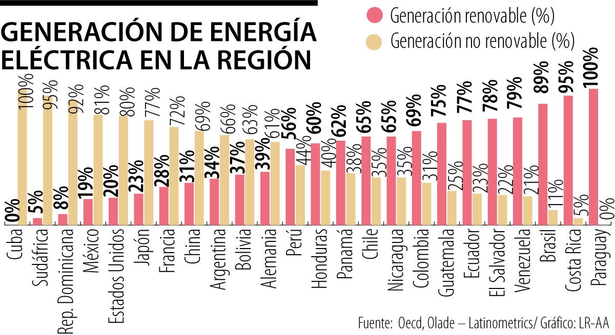 Un reciente informe de Latinometrics reveló que la mayor parte de la energía producida en América Latina es de origen renovable. El liderazgo lo encabeza Paraguay, que genera 100% de su energía eléctrica a partir de fuentes renovables, principalmente hidroeléctricas. En este ranking, Colombia se ubica en la octava posición, por detrás de países como Brasil y Costa Rica. (JM)