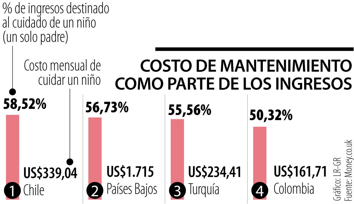 De acuerdo con un estudio de Money.co.uk, Colombia ocupa el cuarto lugar entre los países con el cuidado infantil menos asequible. Con un costo mensual de cuidado infantil de US$161,71 promedio, los hogares monoparentales gastan alrededor de 50,32% de un ingreso de US$321,37 en este rubro. Chile, Países Bajos y Turquía lideran el ranking. (TA)