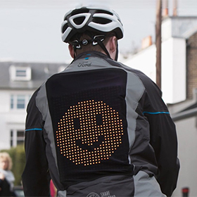 Ford lanzó al mercado una prenda que promete salvar vidas: una chaqueta que proyecta emojis y que le permite a los ciclistas comunicarse con los conductores. La chaqueta cuenta con un panel de malla LED que puede mostrar diferentes ‘caritas’. El ciclista activa cada emoji, indicador y señal de peligro usando un control remoto inalámbrico montado en el manillar de la bicicleta. (MC)