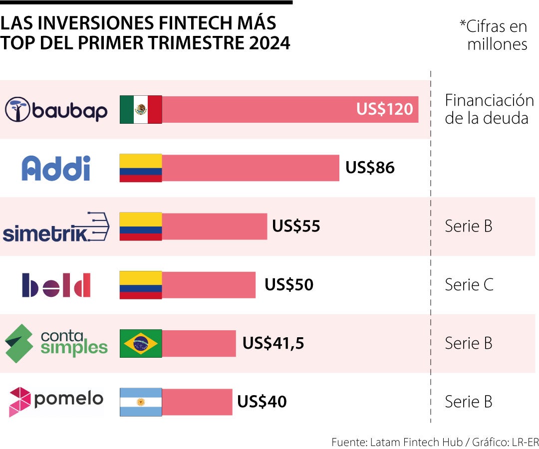 De las cinco fintech que más han invertido en lo que va de año (enero-marzo 2024), tres son colombianas según un reporte de Latam Fintech Hub. Se trata de Addi, la plataforma de créditos online con una inversión de US$86 millones; le sigue Simetrik, una fintech de soluciones financieras B2B, con una inversión de US$55 millones; y Bold, que ofrece soluciones de pagos, con US$50 millones. (VPD)
