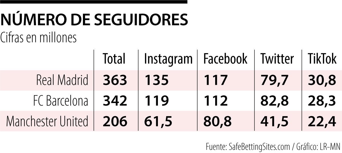 Los equipos de fútbol no solo se enfrentan en el terreno de juego, también lo hacen en las redes sociales. Ahí, el ganador indiscutible es el Real Madrid, que suma 363 millones de seguidores en sus plataformas oficiales. El FC Barcelona y el Manchester United también han construido una gran base de seguidores en las redes sociales, con 342 millones y 206 millones, respectivamente, según SafeBettingSites.com. (TA)