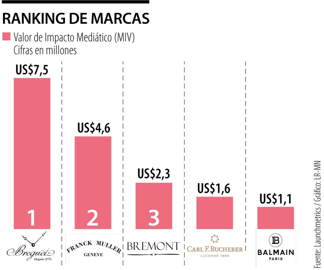 Breguet es la marca de relojes con mayor valor de impacto mediático, de acuerdo con el más reciente ranking de Launchmetrics, seguida por Franck Muller. De acuerdo con la consultora, las casas de relojería están usando estrategias como alianzas con celebridades para aumentar su impacto en redes sociales. Bremont, Carl F. Bucherer y Balmain completan los primeros cinco lugares. (TA)