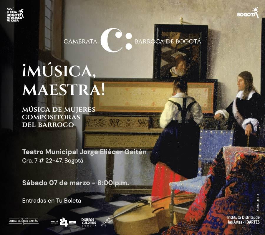 Es un concierto que visibiliza el legado de creadoras del periodo barroco y clásico temprano, con obras interpretadas por la Camerata Barroca de Bogotá. Será el 7 de marzo de 2026 a las 8:00 p. m. en el Teatro Jorge Eliécer Gaitán, en Bogotá, como una propuesta que combina interpretación musical y reflexión sobre el papel de la mujer en la historia de la música.