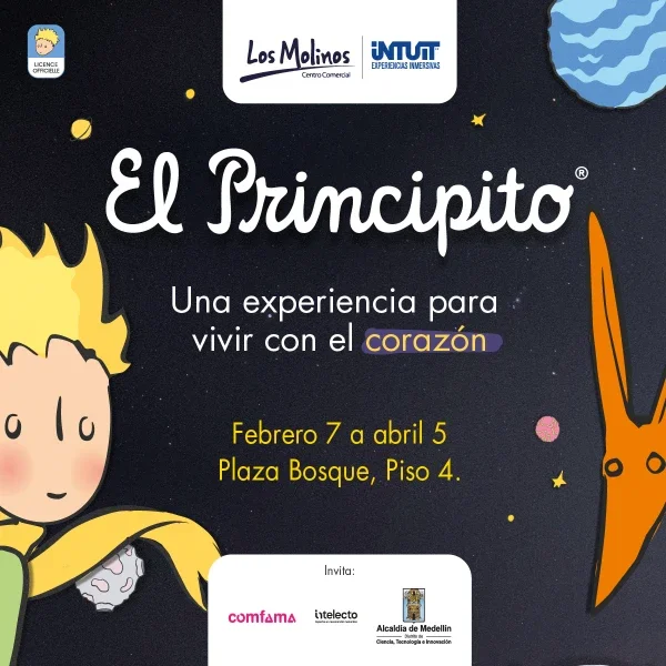 Del 7 de febrero al 5 de abril de 2026, el Centro Comercial Los Molinos en Medellín presenta la experiencia inmersiva ‘El Principito’, una muestra cultural inspirada en la obra de Antoine de Saint-Exupéry. La exposición se realiza en Plaza Bosque, cuarto piso, y está abierta de lunes a viernes de 1:00 p.m. a 8:00 p.m., y fines de semana y festivos de 11:00 a.m. a 8:00 p.m.
