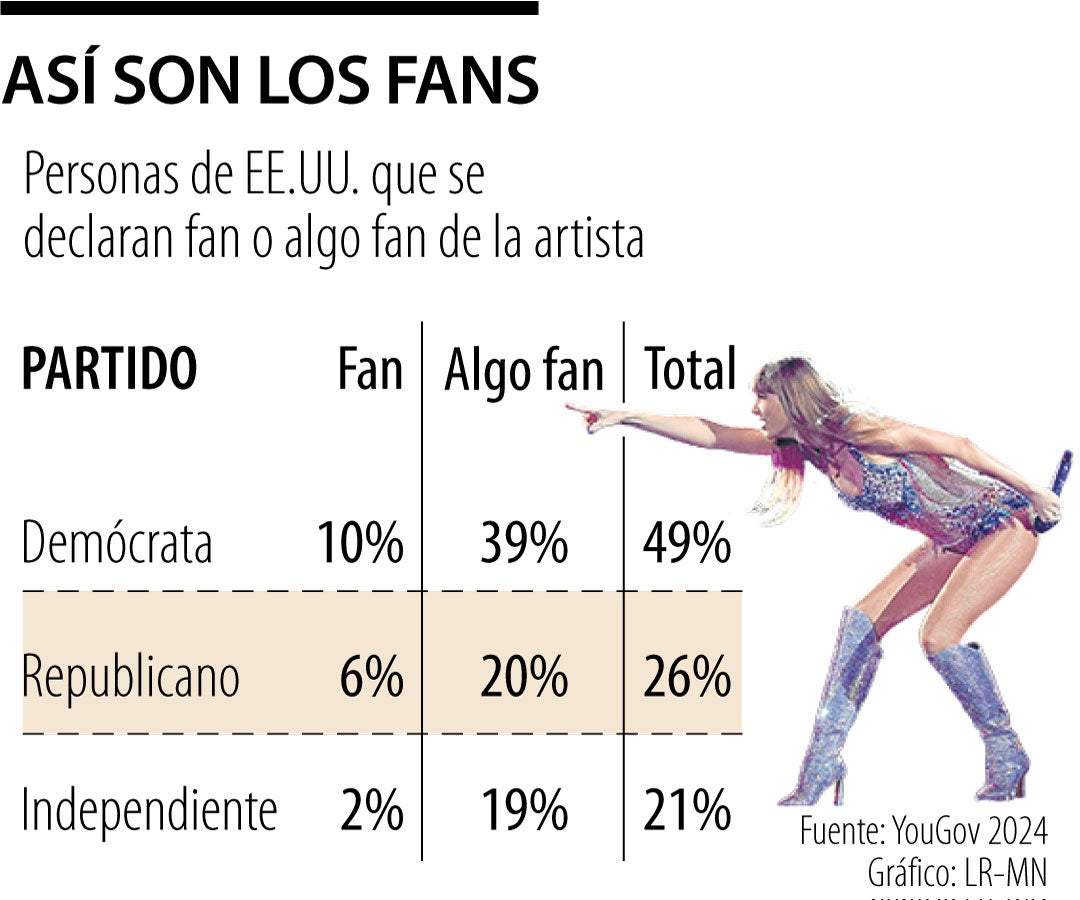 Esa es la pregunta que se hace el diario El País de España en un reciente artículo, en el que señala que Taylor Swift (1989) podría volver a apoyar a Biden (1942) como lo hizo en 2020. Según una encuesta de YouGov y publicada por el medio, 49% de las personas sondeadas que se perciben como demócratas también son fanáticas de la cantante, contra 26% de los republicanos y 21% de independientes. (ta)