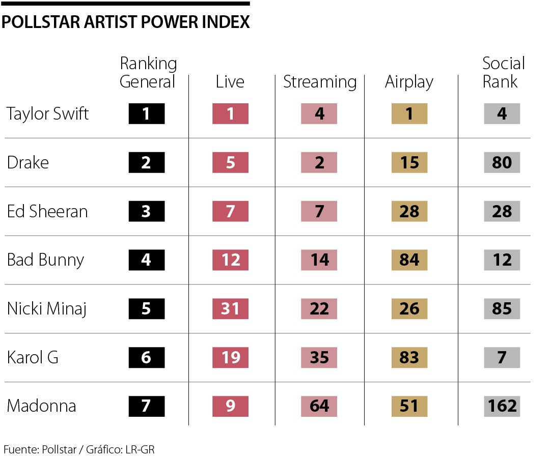 La revista Pollstar, dedicada al análisis de información de la industria del entretenimiento, actualizó el artist power index, el cual se crea con base en el poder de convocatoria a conciertos, reproducciones de streaming, ventas de música y redes sociales. Karol G (1991) aparece como la sexta artista más poderosa, incluso mejor que Madonna (1958); el número uno lo ocupa Taylor Swift (1989). (JL)