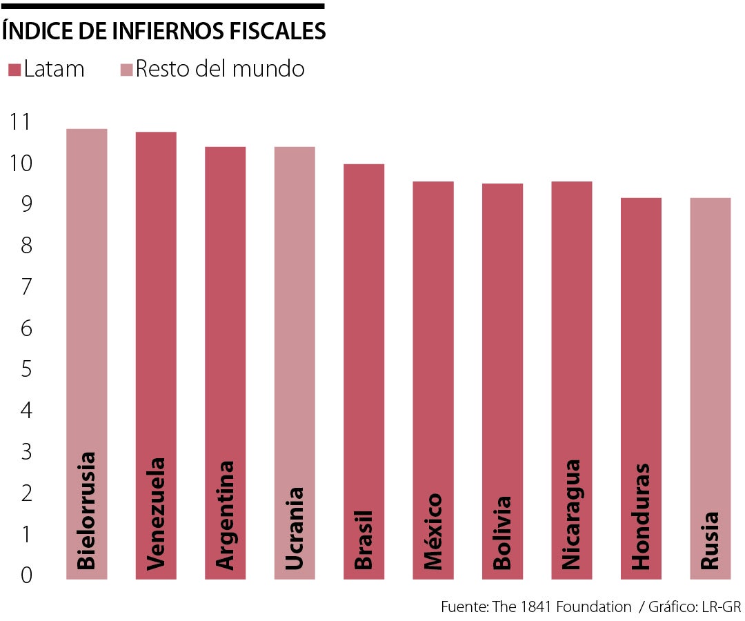 De los 15 regímenes fiscales más estrictos analizados por el índice anual de The 1841 Foundation más de dos tercios se encuentran en Latinoamérica. Según el índice, en la escala intervienen algunos parámetros como el Estado de derecho, los derechos de propiedad, la presión fiscal, la deuda pública y la inflación. El listado en la región lo encabezan Venezuela, Argentina, Brasil y México. (JM)
