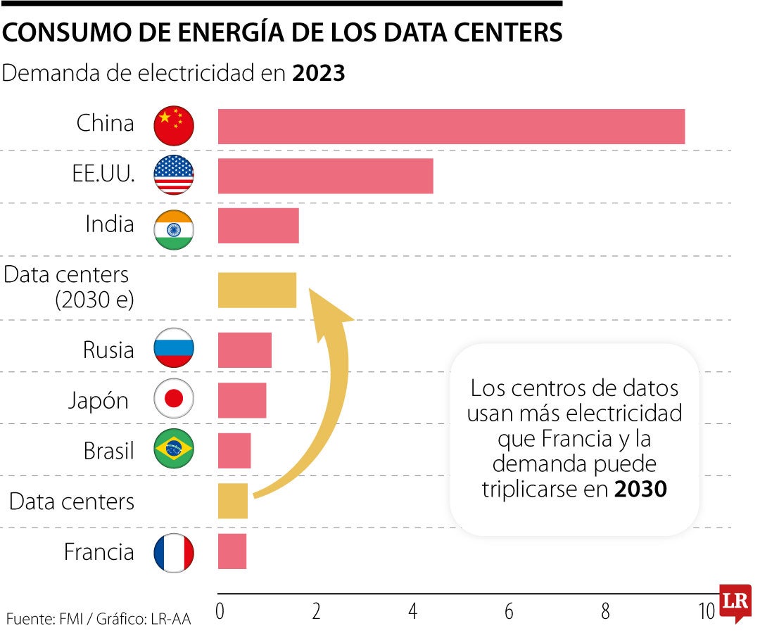 Un informe del FMI alertó el aumento del consumo de energía de los centros de datos. A nivel mundial, consumen más de 500 teravatios-hora, TWh, de electricidad, esto es 6,5 veces más que países como Colombia, que apenas llega a 80 TWh. El organismo multilateral proyecta que los centros de datos consumirán 1.500 TWh en 2030, solo detrás de China, EE.UU. e India. (XB)