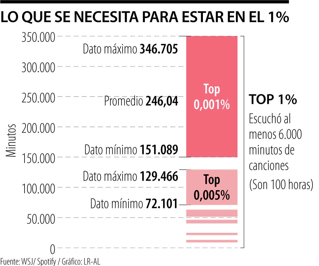 Nadie pone en duda que los swifties pueden ser los fanáticos más comprometidos con su artista: han llevado su gira ‘Eras’ y su película sobre el tour a cifras récord. Por eso, The Wall Street Journal se dio a la tarea de estudiar qué se requiere para ser un gran swiftie: se necesitan 6.000 minutos de escucha de las canciones de Taylor Swift (1989) en Spotify para entrar al 1% de los fans más comprometidos. (TA)