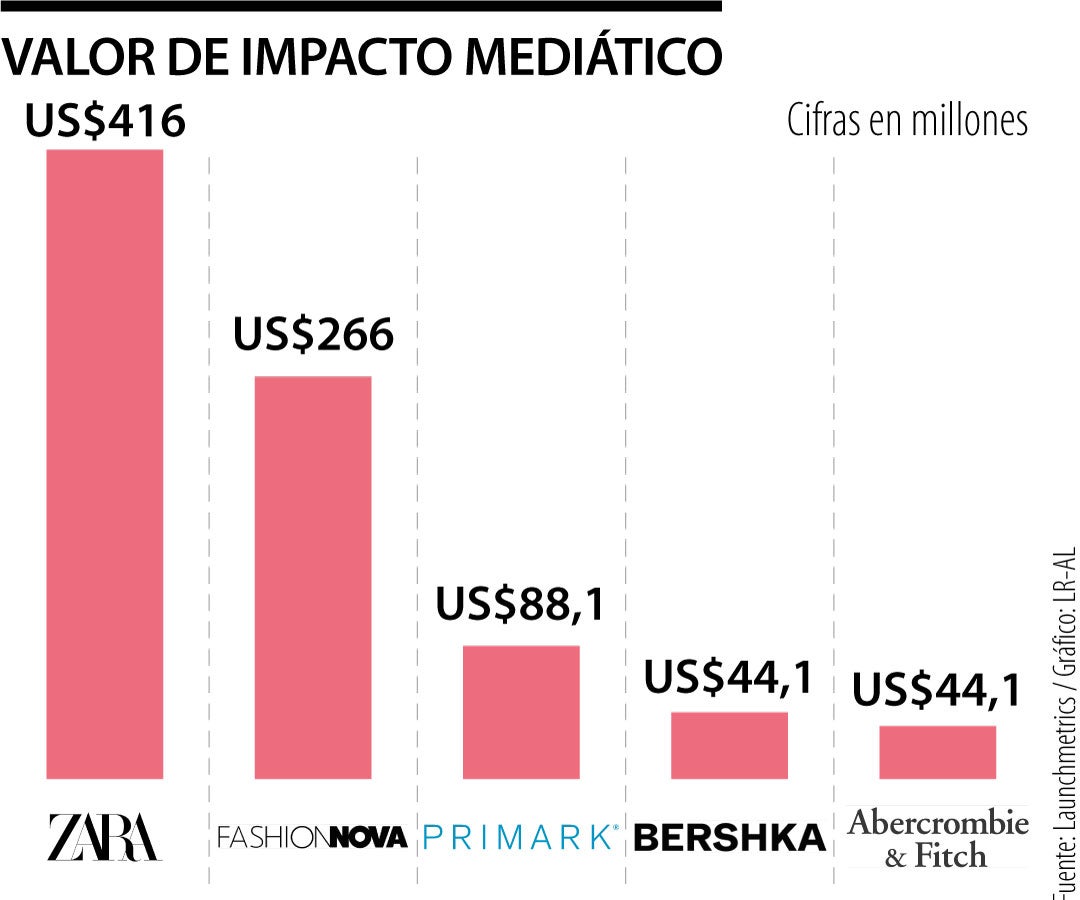 Zara se mantiene en la cima del impacto mediático, MIV, entre las marcas “de moda de calle” según Launchmetrics, dominando el ranking con casi el doble del indicador generado por Fashion Nova, que ocupó el segundo lugar. Zara generó US$416 millones en MIV. Fashion Nova, Primark, Bershka, Abercrombie & Fitch, Pull & Bear, GAP, Old Navy, Banana Republic y Hollister completan el listado. (TA)