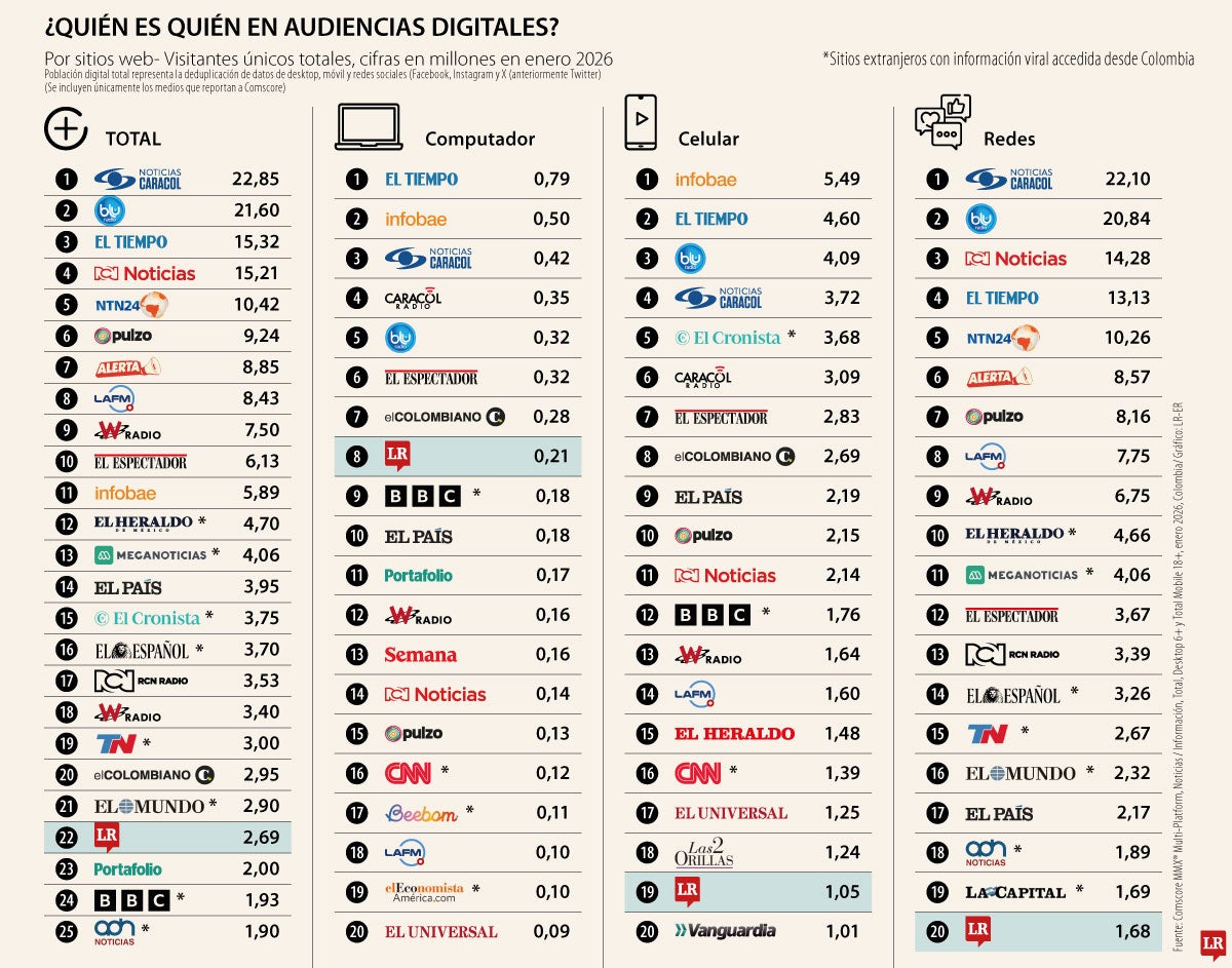 Noticias Caracol, Blu Radio, El Tiempo, Noticias RCN y NTN 24 fueron los portales de noticias e información que lideraron el ranking de audiencias digitales de Comscore en enero. En el listado, La República se ubicó como el medio económico, empresarial y financiero líder en audiencias digitales, en el consumo por celulares, por computadores y en redes sociales. (ta)