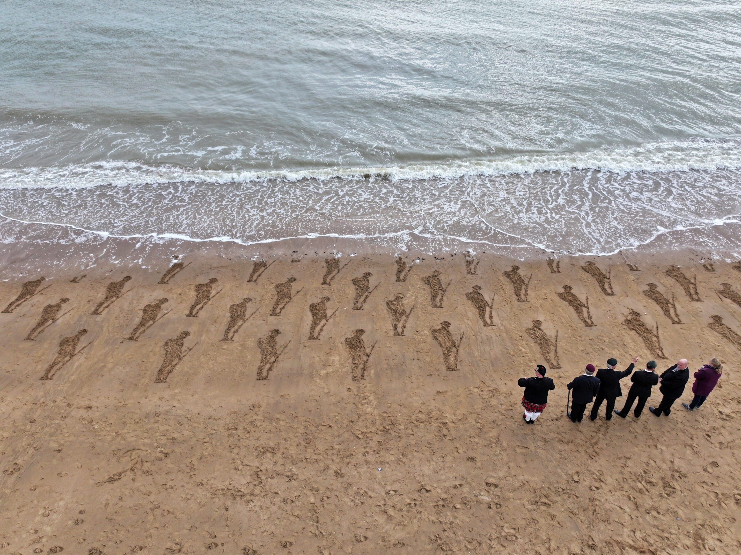 El próximo 6 de junio se cumplirán ocho décadas del Día D, el nombre en clave de la operación militar que marcó el inicio del fin de la Segunda Guerra Mundial. Para conmemorar el desembarco de Normandía, se realizó una instalación en Stone Bay, Broadstairs, Gran Bretaña, con esculturas de 80 soldados hechas de arena por miembros de Royal British Legion Industries (Rbli), que fue visitada por veteranos. (TA)