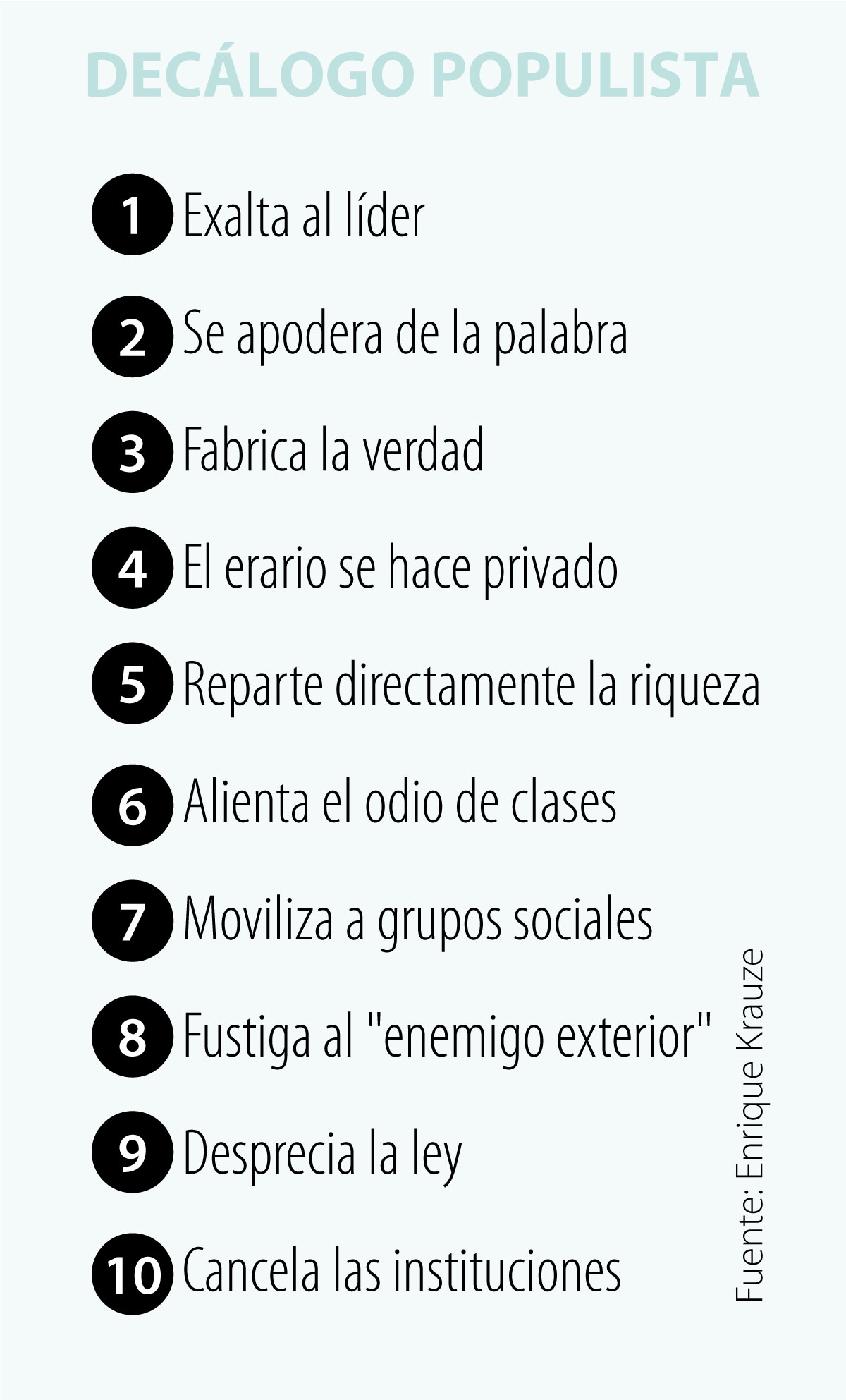 En tiempo electoral aparecen las acusaciones de populismo, y por eso es clave recordar el decálogo de Enrique Krauze. Según este autor, el populista exalta al líder carismático, se apodera de la palabra, fabrica la verdad, hace del erario su patrimonio privado, reparte directamente la riqueza, alienta el odio de clases, moviliza a los grupos sociales, fustiga al “enemigo exterior”, desprecia el orden legal y cancela las instituciones. (MC)