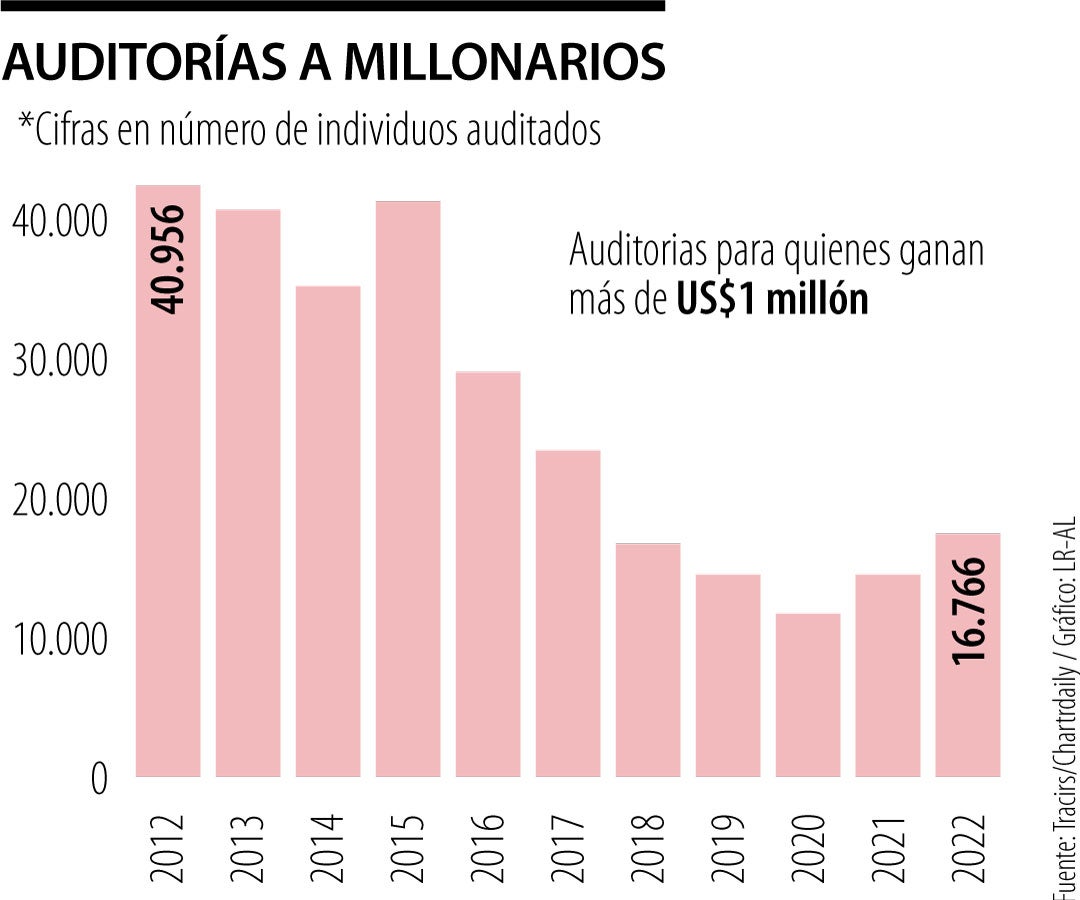 Las auditorías a millonarios del Internal Revenue Service, IRS, la Dian de Estados Unidos, disminuyeron permanentemente desde 2012, cuando las hacía a 41.000 individuos, hasta 2020, cuando llegaron a 11.300. Pero ahora, las auditorías a millonarios están aumentando y en 2022 fueron a más de 16.000 individuos. Ahora, el IRS perseguirá a 1.600 millonarios que deben impuestos. (TA)