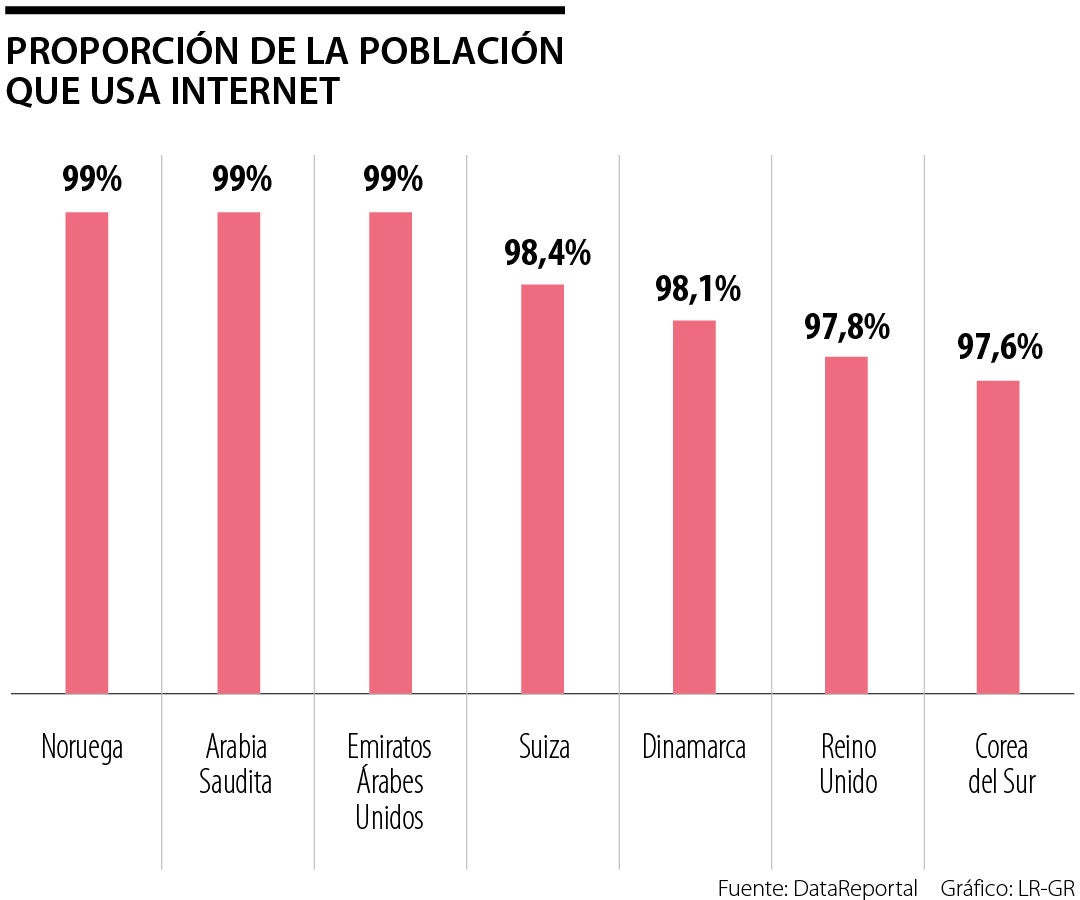 Aunque 65% de la población mundial tiene acceso a internet, las tasas de adopción todavía varían significativamente de un país a otro. Noruega, Arabia Saudita y Emiratos Árabes Unidos tienen las tasas de adopción de internet más altas a nivel mundial, con 99% de su población conectada. Incluso, los tres países tienen una tasa de adopción mucho más alta que las economías más grandes del mundo. (TA)