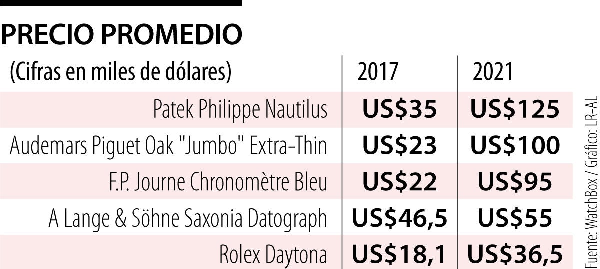 El mercado de reventa está en auge y el accesorio que encabeza la lista de los más buscados es el reloj. Los precios de estos artículos de alta gama de marcas como Rolex, Patek Philippe y Audemars Piguet están por los aires en plataformas de reventa como WatchBox. Mientras el modelo Nautilus de Patek Philippe costaba US$35.000 en promedio en 2017, para finales de 2021 su precio era de US$125.000. (TA)