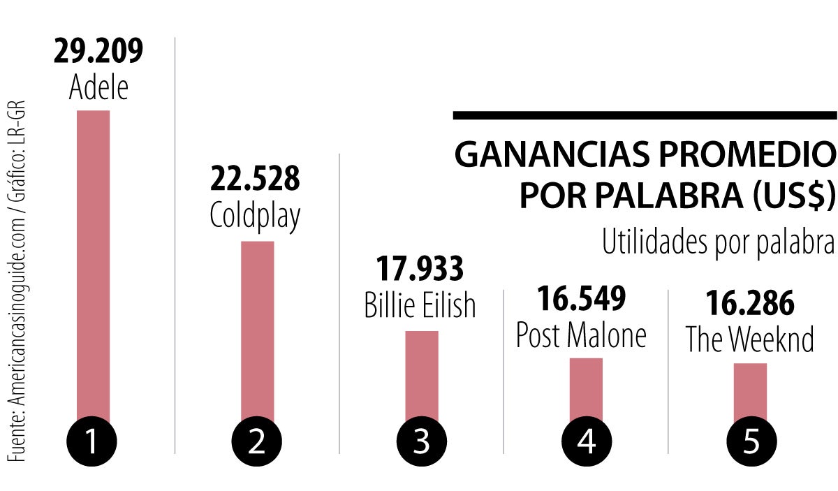 La cantante británica Adele (1988) es la artista que más gana por palabra cantada, con US$29.208 por cada una en promedio, de acuerdo con un estudio realizado por Americancasinoguide.com. Coldplay y Billie Eilish (2001) completaron el top 3 con US$22.528 y US$17.933, respectivamente. Para elaborar el informe, la firma dividió las utilidades de cada canción en Spotify por el número de palabras de cada tema. (TA)
