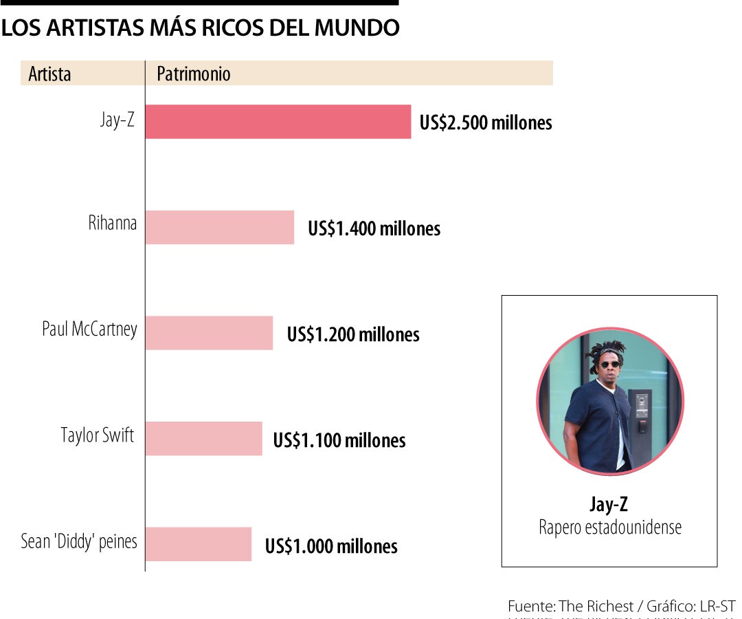 Aunque Taylor Swift (1989) cruzó la marca de los US$1.000 millones en patrimonio neto en octubre, convirtiéndose oficialmente en un músico multimillonario, no es la más rica del mundo entre sus colegas. El título del artista con mayor riqueza en el mundo 2024 lo tiene Jay-Z (1969), quien lo mantiene desde 2019, con US$2.500 millones, superando a los otros de la lista en casi US$1.000 millones. (AG)