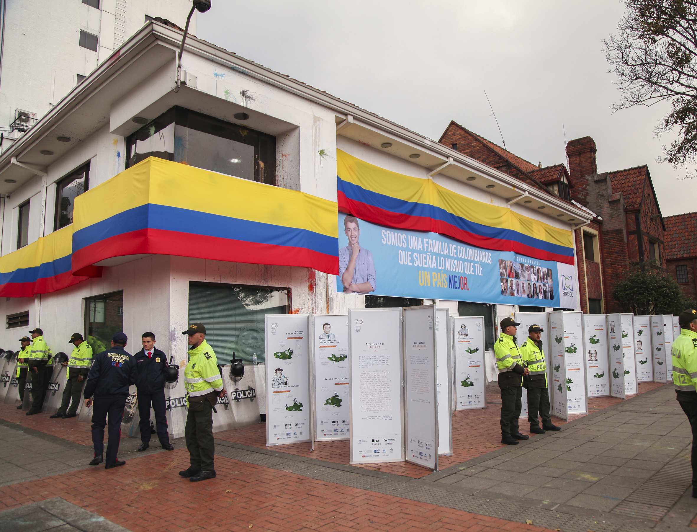 Como una invitación a que los ataques ocurridos en anteriores jornadas estudiantiles no se repitieran, la sede de RCN Radio exhibió ayer durante la séptima gran movilización de las universidades públicas del país una bandera de Colombia, con un mensaje de unidad, y una exposición con paneles que mostraban a las personas asesinadas debido al conflicto armado.