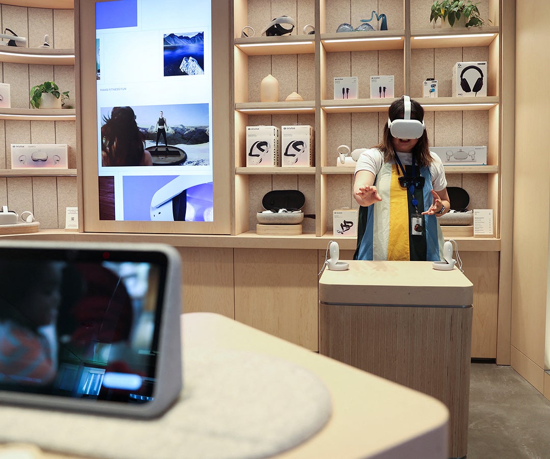 Meta Platforms Inc., propietario de Facebook, dio un vistazo a su primera tienda física, que tiene una pantalla de piso a techo para mostrar juegos de realidad virtual y salas para probar dispositivos de videollamadas. La tienda, que abrirá el 9 de mayo, está ubicada en el campus principal de la unidad Reality Labs de Meta, en Burlingame, en Silicon Valley, California. (TA)