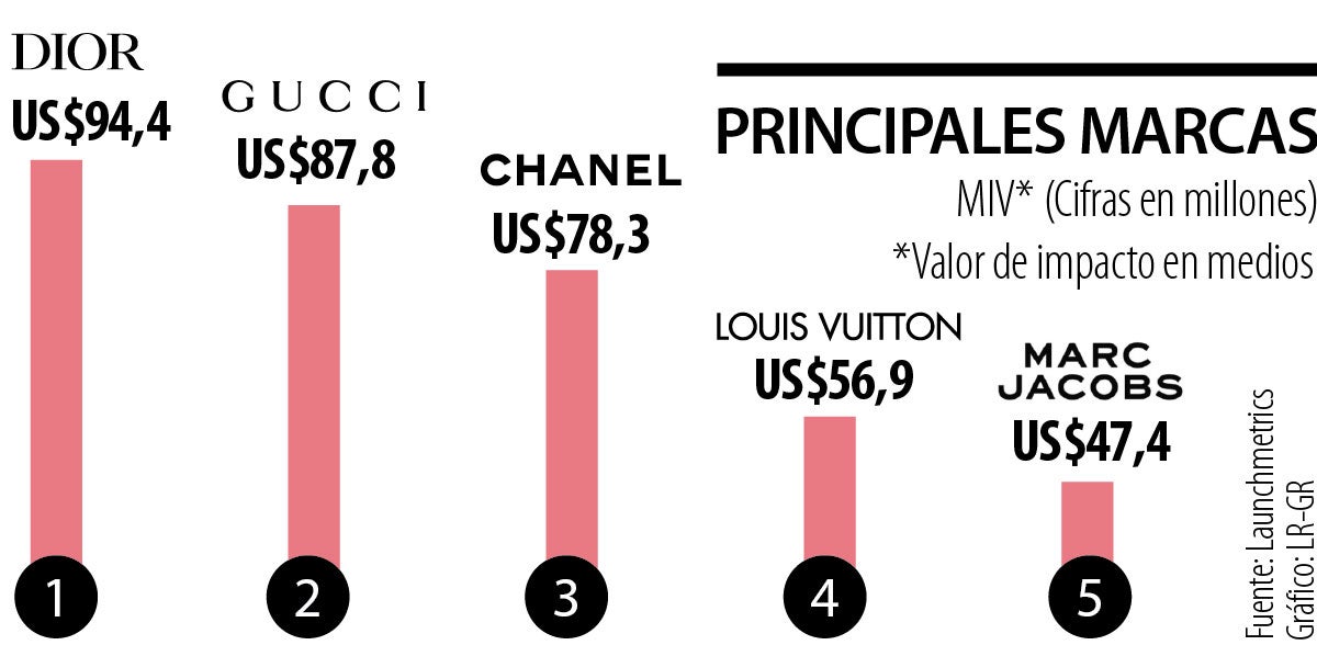 Dior, con US$94,4 millones; Gucci, con US$87,8 millones; y Chanel, con US$78,3 millones; son las marcas de lujo con el mayor valor de impacto mediático (MIV) en Estados Unidos, según un informe de Launchmetrics. Les siguen Louis Vuitton (US$56,9 millones) y Marc Jacobs (US$47,4 millones). Este dato mide el valor de todas las actividades de marketing de las compañías. (TA)