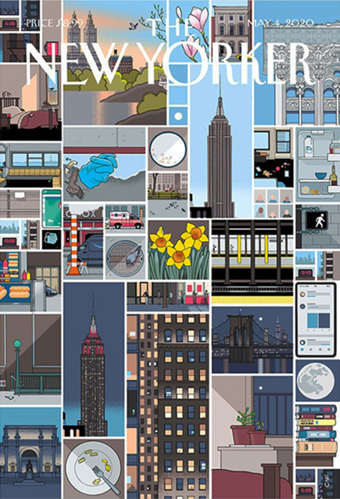 La más reciente portada de The New Yorker presenta un relato por fracciones de cómo es un día ahora en Nueva York, el centro de la pandemia de covid-19 en Estados Unidos. La revista reúne fragmentos de la vida en las calles, las casas, hospitales y miles de otros lugares donde se resguardan las personas. La ilustración de Chris Ware compila estos fragmentos de vida en la portada de la siguiente edición. (LM)