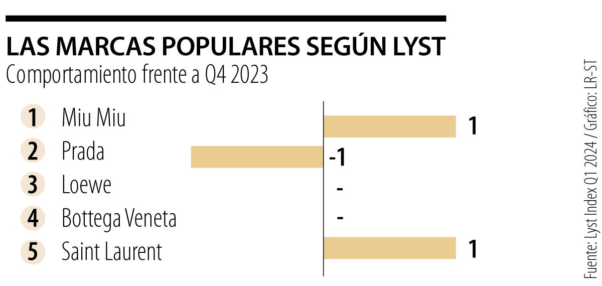 El universo de Miuccia Prada (1949) atrae a cada vez más personas, o al menos eso es lo que muestra la plataforma de compras Lyst en su primer índice del año. Prada lideró su clasificación de las marcas y productos más buscados a finales de 2023, y Miu Miu ahora toma el trono en el primer trimestre de 2024. Las búsquedas de la segunda aumentaron 8 %, con tres piezas entre los 10 productos más populares. (TA)