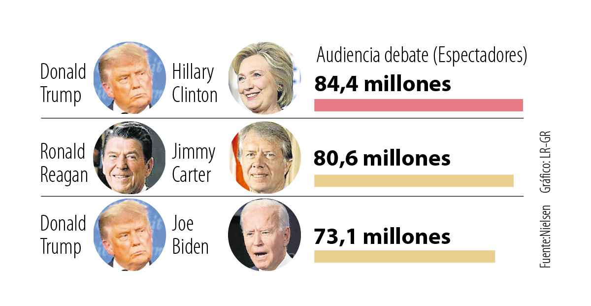 Aunque el debate entre Donald Trump (1946) y Joe Biden (1942) el pasado jueves fue uno de los más decepcionantes en la historia de EE.UU., el índice de audiencia de televisión de Nielsen asegura que fue el tercero más visto en ese país con 73,1 millones de espectadores. El más visto fue el de Trump contra Hillary Clinton (1947) en 2016 (84,4 millones) y le sigue el de Reagan y Carter en 1980 (80,6 millones). (VP)