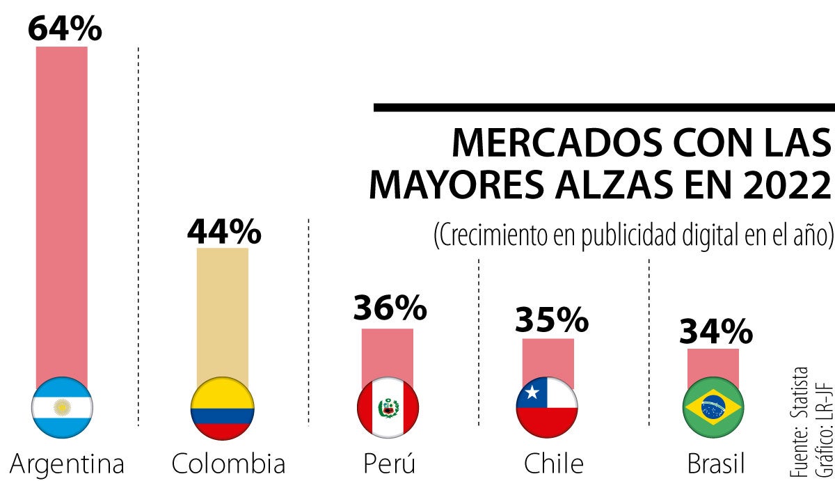 La pandemia aumentó el tráfico en línea, lo que brindó oportunidades para que las empresas mantuvieran a su público objetivo comprometido a través de iniciativas de marketing digital. Datos de Statista muestran que Argentina tiene el mercado de más rápido crecimiento a nivel mundial en publicidad digital (64%), seguido por Colombia (44%), Perú (36%) y Chile (35%). (TA)