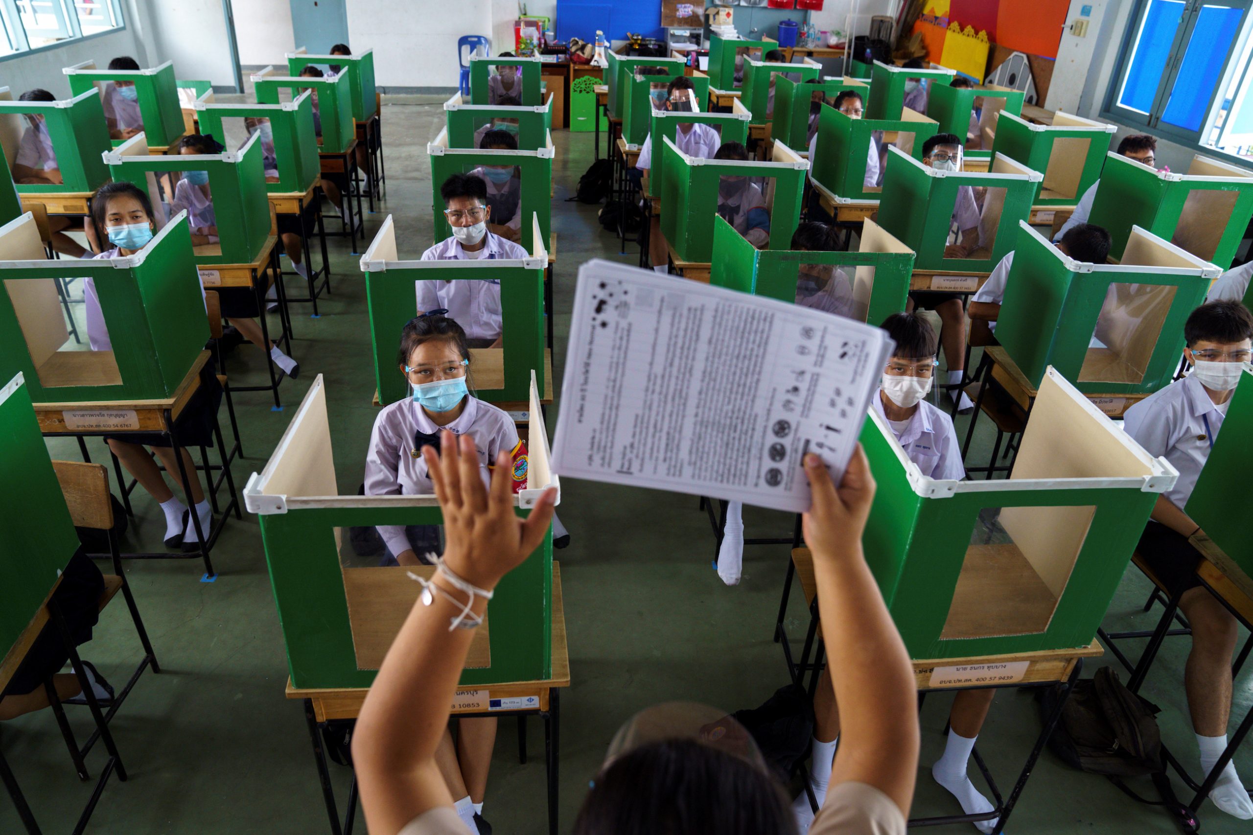 Pese a que en Colombia continúan las discusiones sobre cómo reabrir los colegios, en el mundo ya hay varios ejemplos de la manera en la que los estudiantes están volviendo a clases, y más tras el pedido de la ONU para hacerlo de manera urgente. Uno de ellos es el de Tailandia en el que cada alumno cuenta con un cubículo para garantizar el aislamiento, como una medida de protección contra el virus. (CR)