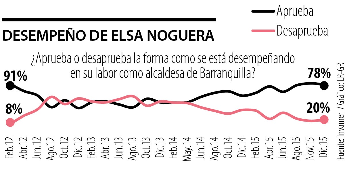 La más reciente encuesta de Invamer muestra que la aprobación de Elsa Noguera (1973) cuando fue alcaldesa de Barranquilla fue mayor que la que ha registrado como gobernadora de Atlántico. Noguera registró una aprobación de 91% al inicio de su mandato como alcaldesa y aunque la cifra descendió a lo largo de su periodo, terminó en 78%. Como gobernadora su aprobación ha llegado hasta 80%.