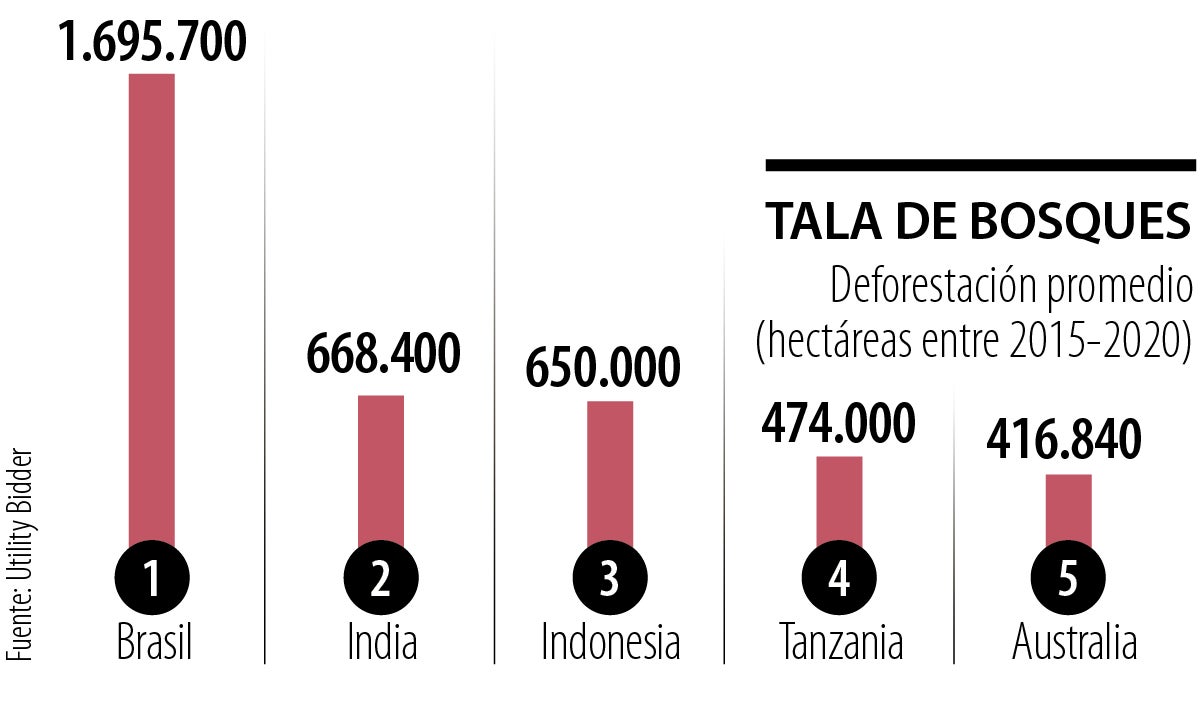 No sorprende que el calentamiento global sea cada vez mayor, pues entre sus mayores contribuyentes está la deforestación. Un estudio reveló cuáles son los países con las tasas de deforestación más altas del mundo, y con casi 200.000 hectáreas de bosques destruidos entre 2015 y 2020, Colombia ocupa el puesto 11. Brasil, India, Indonesia, Tanzania y Australia forman el top cinco según Utility Bidder. (TA)