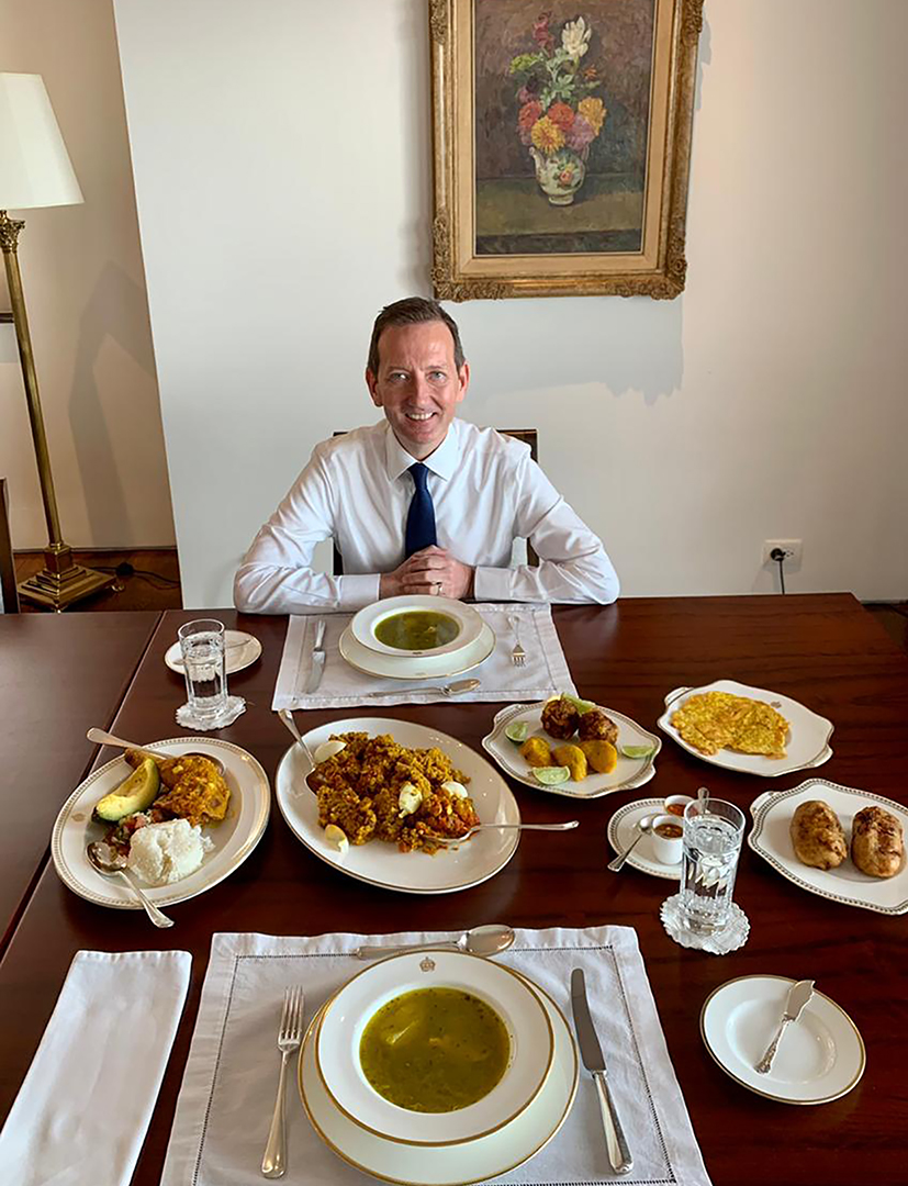 Esta semana, el embajador del Reino Unido en Colombia, Colin Martin-Reynolds, se encuentra en una visita oficial en Cali, en donde no ha perdido oportunidad para probar lo mejor de la tradición de la capital del Valle del Cauca. Entre lo que ha podido disfrutar se encuentra este gran almuerzo con sancocho, arroz atollado, marranitas, una porción de empanadas, aborrajado y de bebida, champús. (CR)